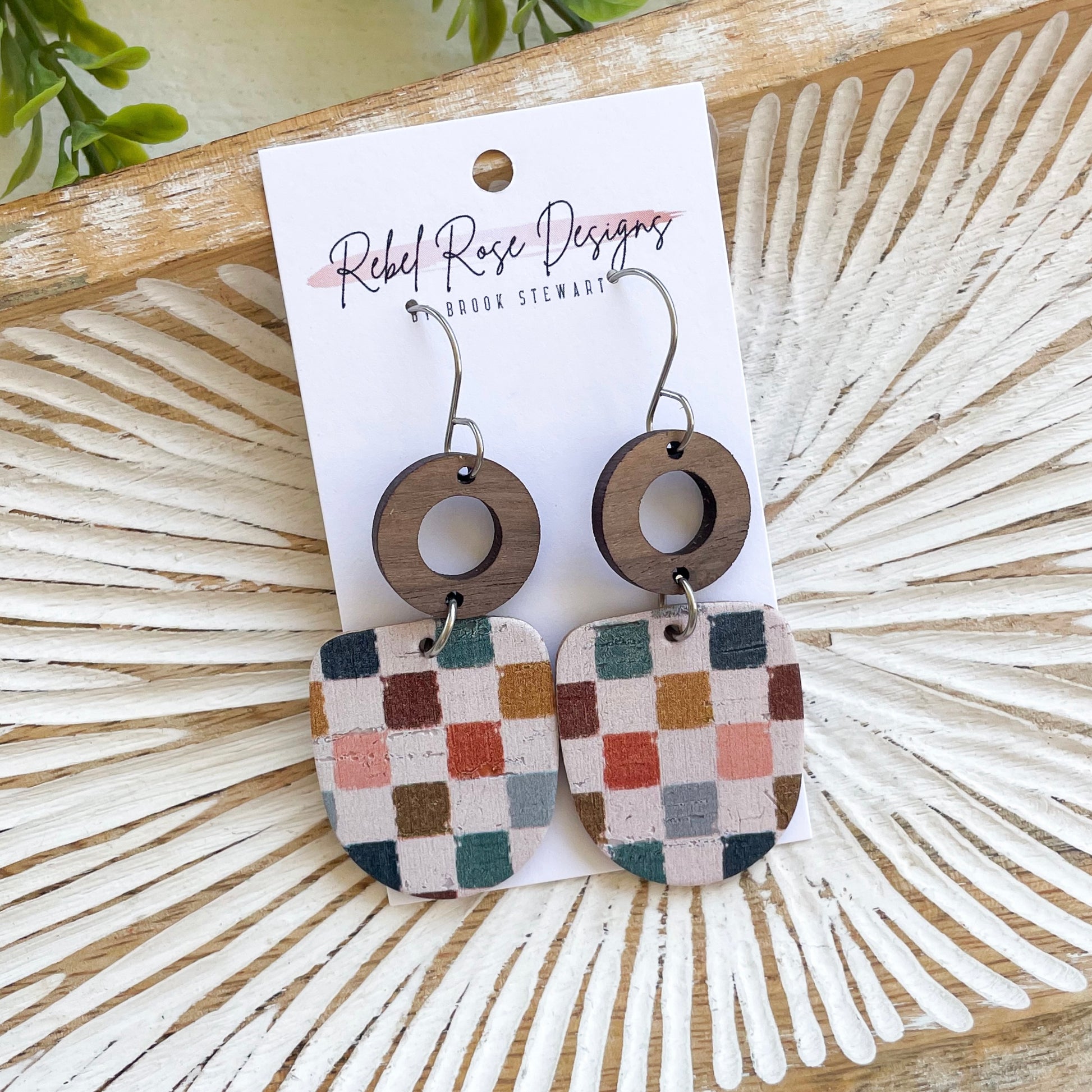The Scout earring in an array of gorgeous autumn colored checks on cork on leather with a round wood connector.